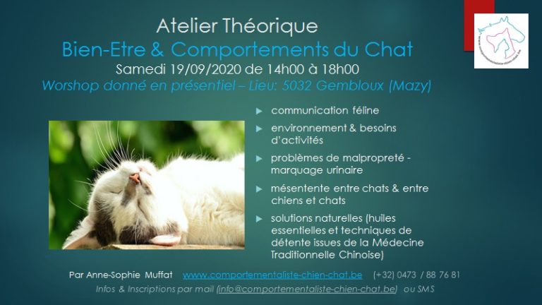 Conférence Bien-Être & Comportement du chat Mardi 30.01 à 19:00Par Anne-Sophie Muffat, Coach en comportement canins et félinsComprendre son chat afin de vivre avec lui une relation équilibrée, harmonieuse et respectueuse : Sociabilité, génétique et comportements :chats d’intérieur et d’extérieur Besoins d’activités Besoins physiologiques Ses…